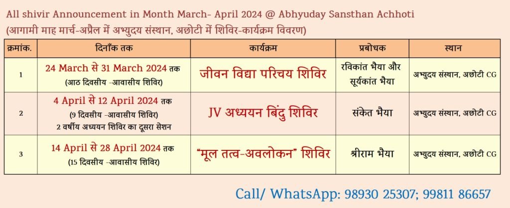 अभ्युदय संस्थान अछोटी में आगामी दो माह में तीन शिविर कार्यक्रम एक के बाद एक होने वाले हैं.