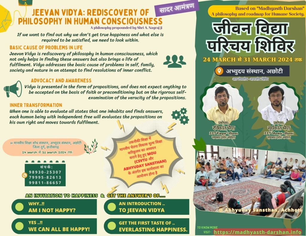 अभ्युदय संस्थान, अछोटी में जीवन विद्या परिचय शिविर के लिए.. आरक्षित करें अपना समय🙏